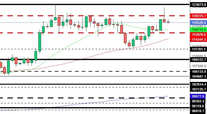 - Major Resistance: ~$117,000 to ~$123,000–$126,000 (zone of several recent highs).